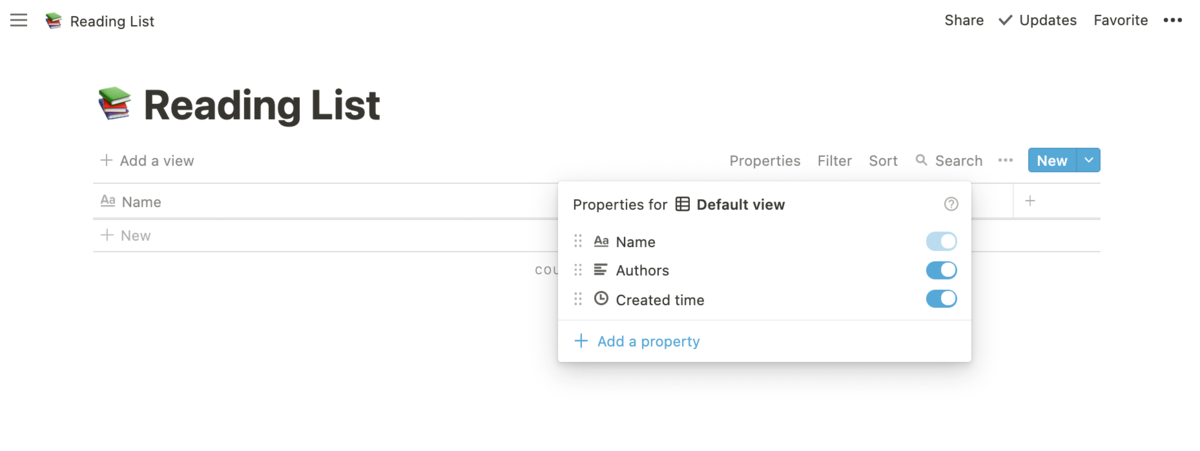 空のページにTableを配置して、プロパティにAutours(テキスト)、Created time(日付)を追加します。下図を参考にしてください。ShareからIntegrationを設定してください。